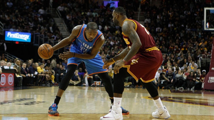Оклахома Сити приема Кливланд в интригуващ сблъсък от НБА, който ще противопостави суперзвездите Кевин Дюрант и ЛеБрон Джеймс.